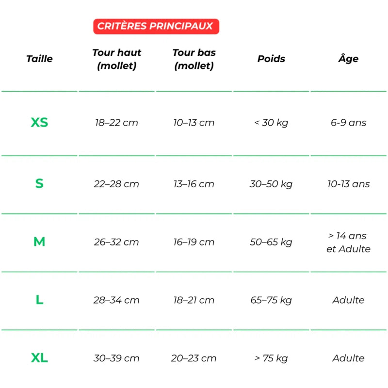 Nos protège-tibias sont disponibles en plusieurs tailles, adaptées à tous les âges et tous les gabarits. Consultez notre guide des tailles pour connaître les mesures et les recommandations afin de garantir une tenue parfaite pour un confort et une protection idéale.